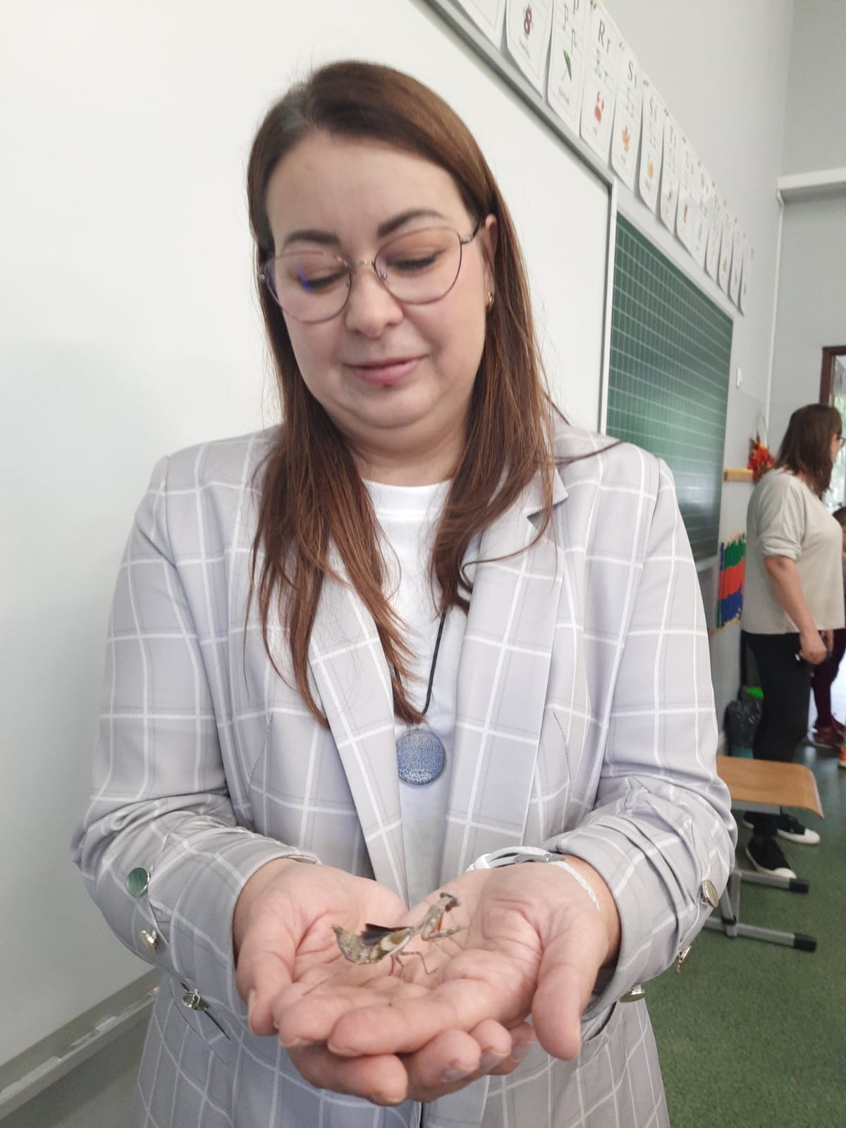 Kamila od lat interesuje się hodowlą nietypowych zwierząt 🦎 – i to właśnie one były bohaterami warsztatów. Gekon oraz modliszki podbiły serca młodych umysłów. Dzięki zaangażowaniu Kamili oraz jej asystentki Martyny Globisz uczniowie klas 1–3 mogli poznać ciekawostki o zwyczajach nietypowej hodowli, a nawet dotknąć żywych okazów.